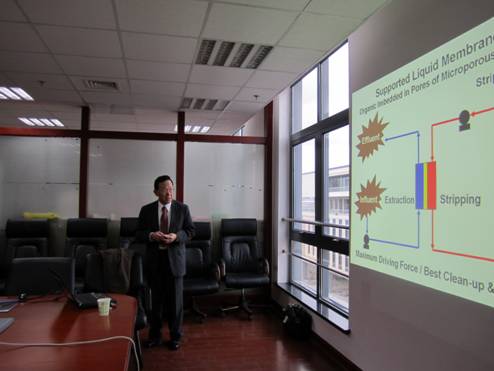 Prof. HE Tao, Head of Membrane Materials and Separation Engineering Technology Lab, Sustainable Technology Research Center, hosted the meeting. Prof.HE Wenshou introduced the feasibility and application of Membrane Materials vividly by two aspects: removal & recovery of metals from waste water by supported liquid membranes, and water purification by interfacially polymerized reverse osmosis membranes. He also provided examples to illustrate his research application.