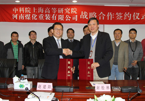 November 13th,2012 - Shanghai Advanced Research Institute of Chinese Academy of Sciences (SARI-CAS) signed a Collaboration Agreement with Henan Coal Chemical Industry Group (HNCC) Heavy Equipment Co., Ltd, under the witness of Deputy General Manager of HNCC Heavy Equipment Co., Ltd Mr. ZHAO Jianyang, President of SARI-CAS Prof. FENG Songlin, Deputy Director of S&T Department of SARI Mr. HUANG Yucheng and Director of Center for Service Sciences of SARI Prof. CHEN Xiaodong.