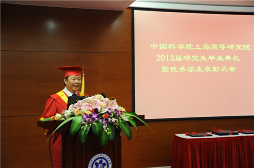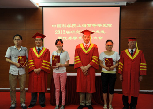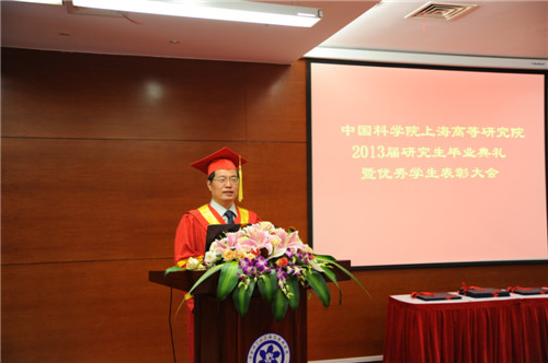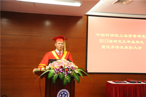 On the afternoon of 18th June, 2013 Postgraduate Graduation Ceremony of Shanghai Advanced Research Institute (SARI) was held in SARI’s G&A building. More than 60 people, including institute leaders, members of academic degree evaluation committee, tutors and all graduate students attended the ceremony. Prof. SUN Yuhan, Secretary of Party Committee and Vice President of SARI, hosted the ceremony. Students received diplomas from Prof. JIANG Biao, Chairman of academic degree evaluation committee and Vice Chairmen Prof. FENG Song and Prof. SUN Yuhan.
