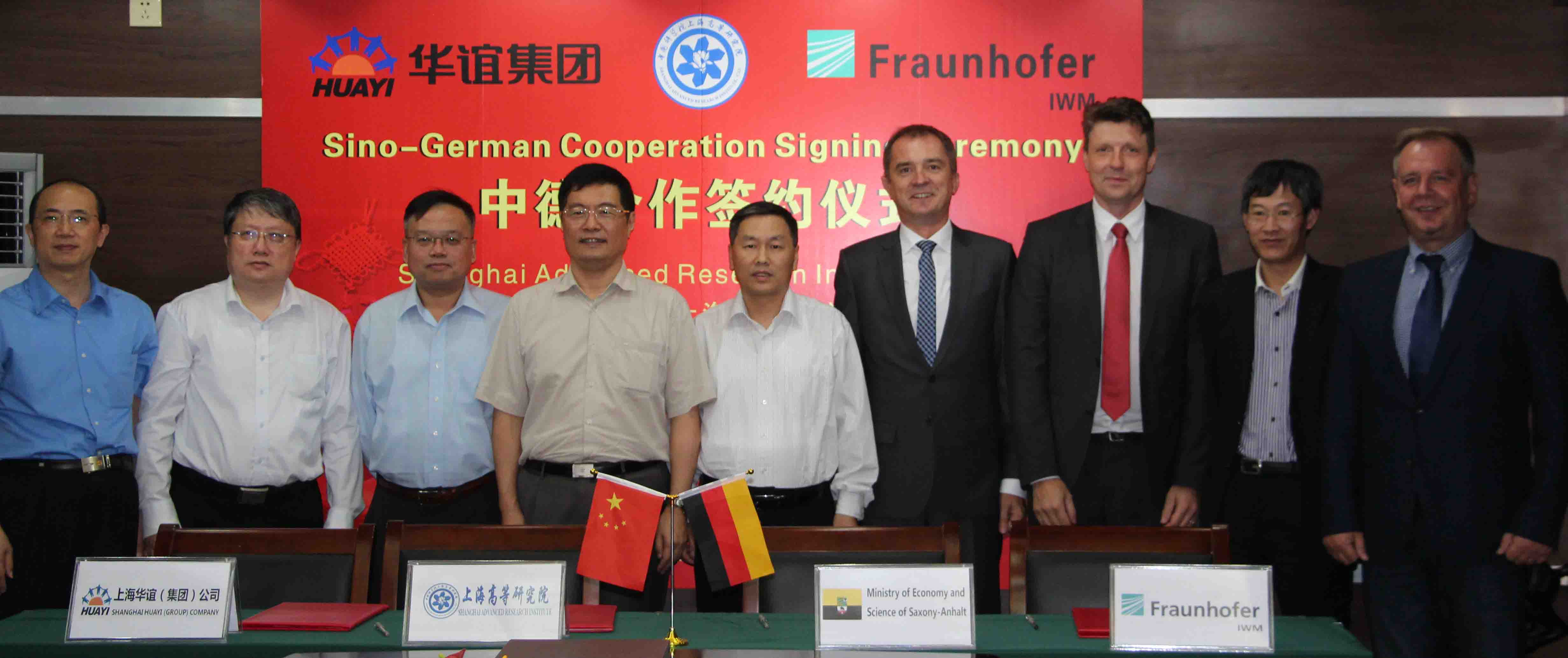 Shanghai Advanced Research Institute of Chinese Academy of Sciences (SARI-CAS) signed a Memorandum of Understanding with Fraunhofer Institute for Mechanics of Materials Halle (Fraunhofer IWM) and Shanghai Huayi (Group) Company (Huayi) on September. 24th , 2015, regarding joint conferences on the subject of Alternative rawmaterials for the chemical and plastics-processing industry.