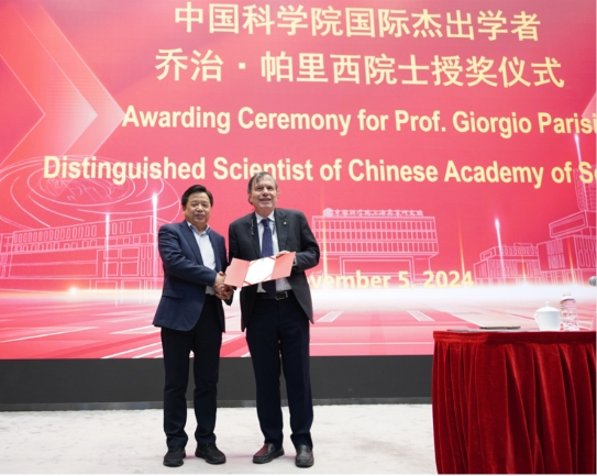 The event started with a welcome address from President of SARI Prof. Huang Zhengren, who extend his warmest welcome and sincerest gratitude to Prof. Parisi on behalf of SARI, followed by the Awarding Ceremony of the Distinguished Scientist of Chinese Academy of Sciences for Prof. Parisi.