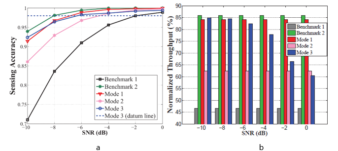 Performance comparison among three intelligent sensing strategies: a) Sensing accuracy performance; b) Throughput performance (Image by SARI)