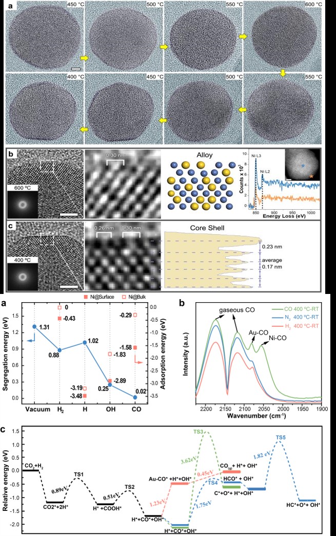 In situ observation and theoretical interpretation of the structural transition of NiAu NPs during the reaction (Figures adapted from Nature Catalysis)