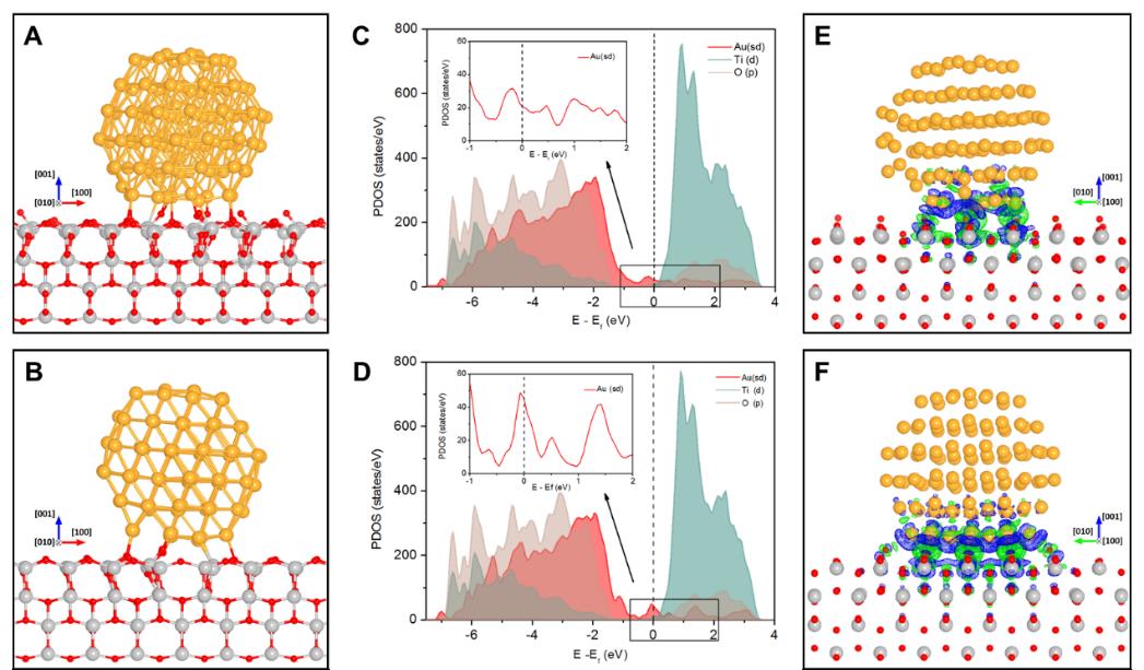 Figure 1. Geometric and electronic structure of Au-TiO2 interface under CO/O2 (A, C, E) and O2 environment (B, D, F) (Image adapted from Science)