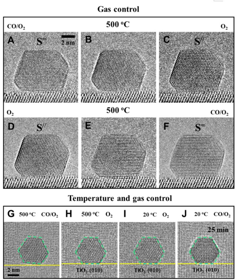 To exploit the promoted activity of Au-TiO2 interface, researchers conducted additional top-view observations and found that this configuration remained unchanged when cooling from 500 °C to 20 °C in CO and O2 reactive environments, showing the rotation of the Au nanoparticle was also temperature dependent in reaction conditions.
