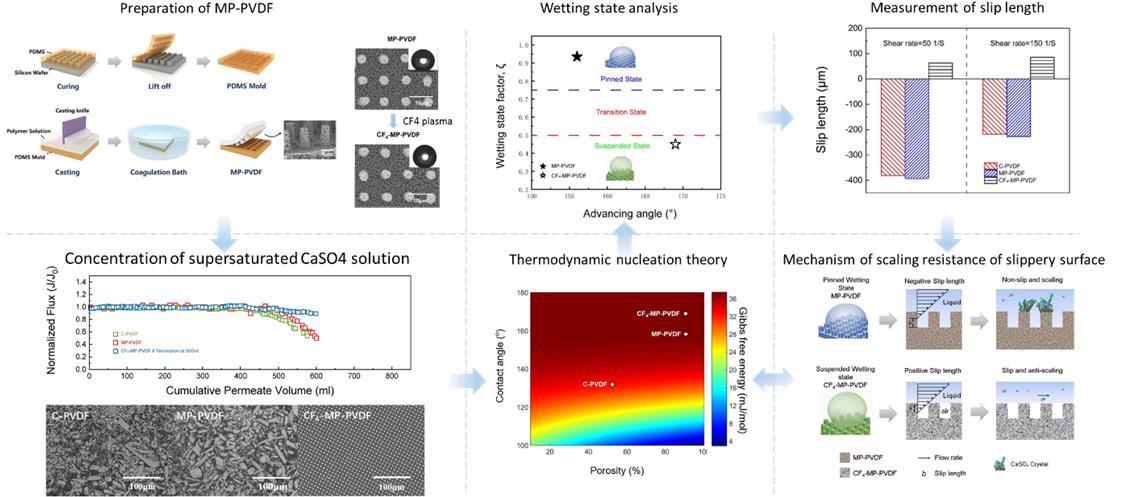 Recently, researchers have been attempting to adopt superhydrophobic membranes for improving the scaling and fouling resistance of MD. But discrepancy in results when using different models has been reported. To unravel this puzzle, a research team led by Prof. HE Tao at Shanghai Advanced Research Institute (SARI) of the Chinese Academy of Sciences, collaborating with Prof. YIN Huabing at University of Glasgow in the UK and Professor VOLKOV Alexey from A.V. Topchiev Institute of Petrochemical Synthesis, Russian Academy of Sciences, proposed a hydrodynamic theory of slippery surface for fouling/scaling resistance of superhydrophobic membranes.