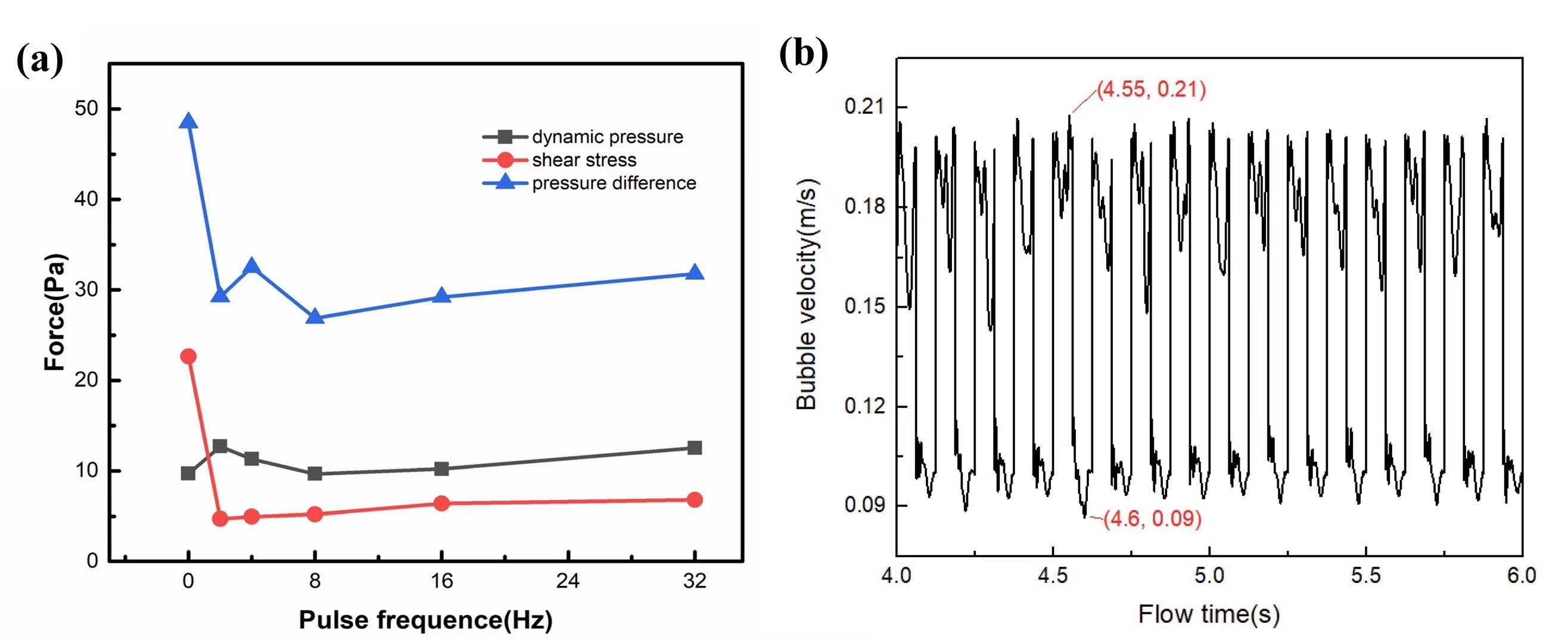 Figure 3 (a) Forces versus pulse frequency f at the T-junction, (b) Bubble velocities at downstream(Image by SARI)