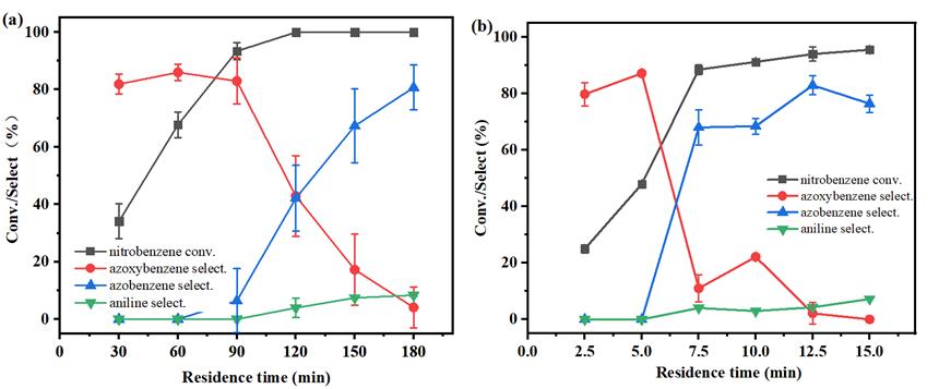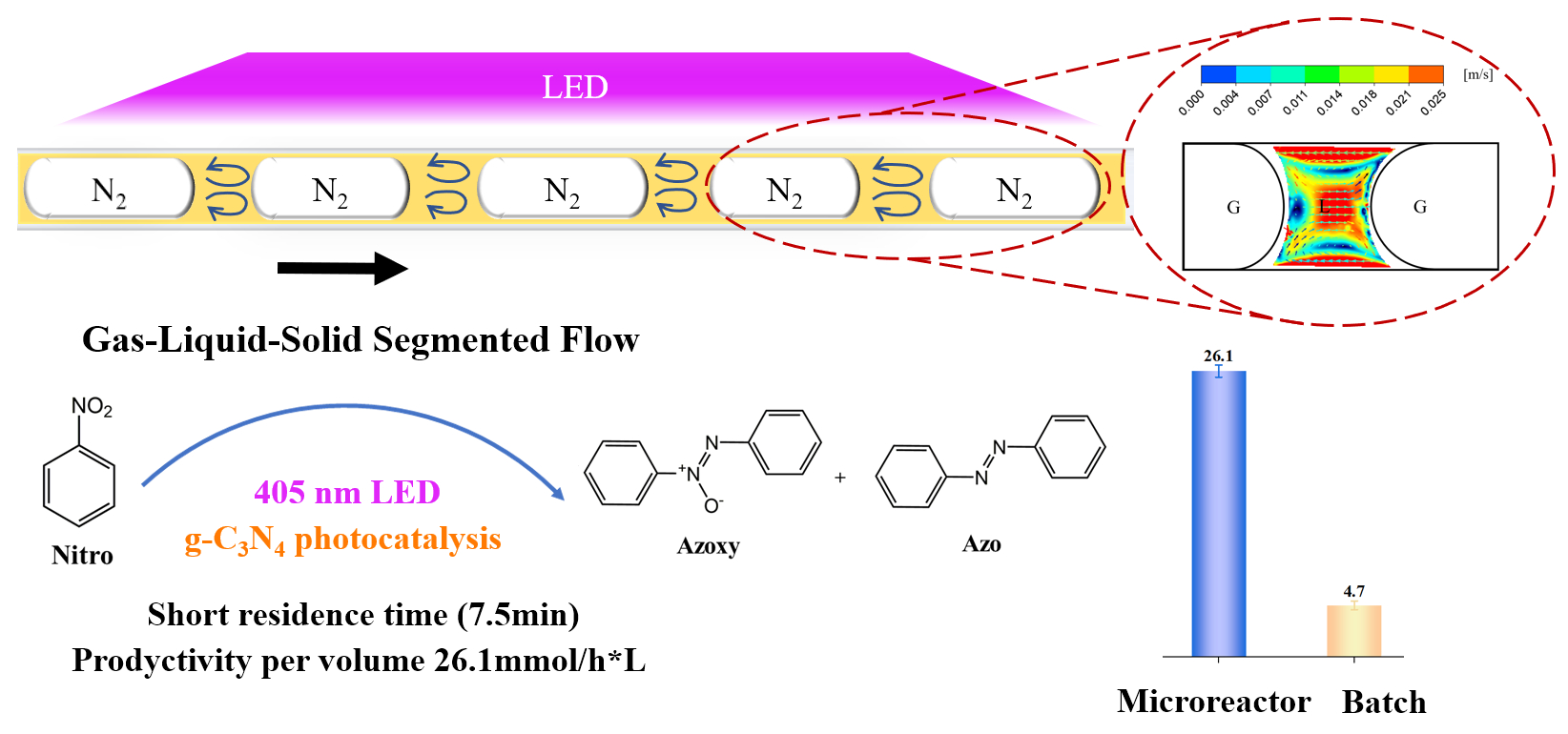 Azobenzene and azoxybenzene are important precursors in pigment industry, electronic industry and pharmaceutical industry. In this work, the selective synthesis of azo- compounds from nitrobenzene by graphitic carbon nitride (g-C3N4) photocatalysis was selected as model photocatalytic reaction. By combing the visual flow experiments, the model reaction under gas-liquid-solid segmented flow was investigated thoroughly. Meanwhile, the effects of flow behavior on the photoreaction performance were quantified.