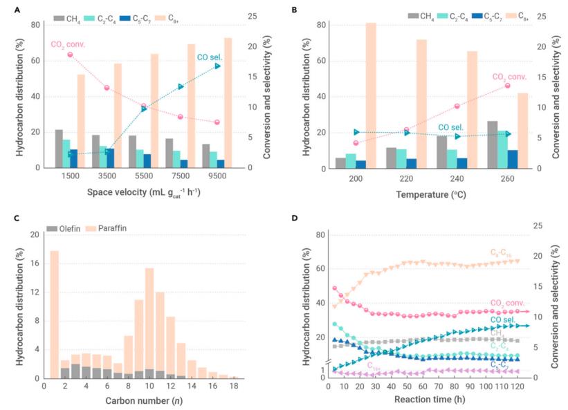 Figure 1. The evaluation data of CO2 hydrogenation over CoFe-0.81Na catalyst. Effects of (A) space velocity and (B) reaction temperature on conversion of CO2, selectivity of CO, and hydrocarbon distribution (Image by SARI)