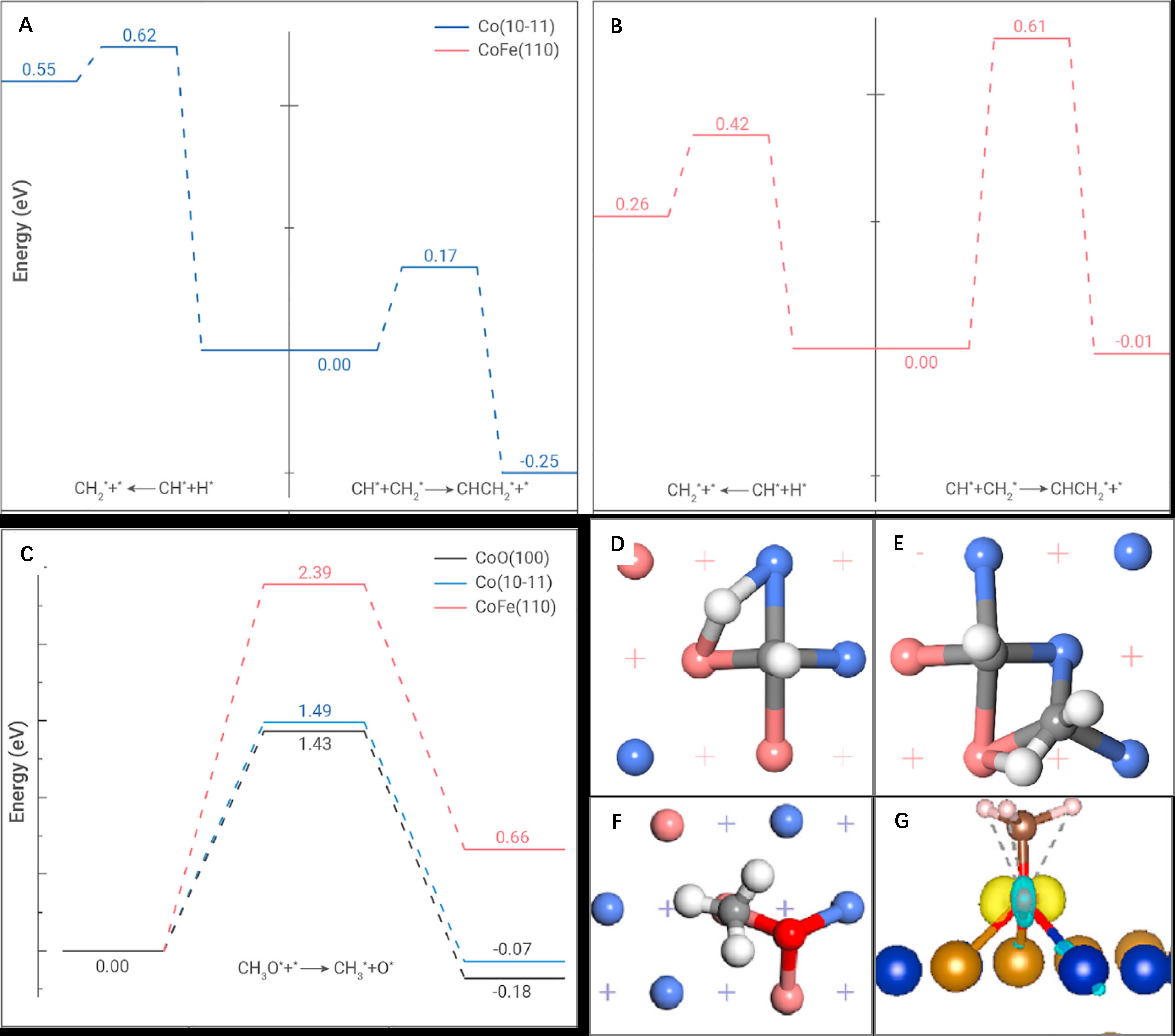 Figure 2. Density functional theory studies on CO2 hydrogenation to jet fuel. Potential energy profiles of the C-C coupling and CH* hydrogenation over (A) Co and (B) CoFe catalyst surfaces, and (C) of the CH3O* dissociation on Co, CoFe and CoO surfaces. Transition state structures of (D) C-C coupling, (E) CH* hydrogenation, and (F) CH3O* dissociation over the CoFe catalyst surface, and (G) charge density difference of the CH3O* adsorbate over the CoFe catalyst surface. (Image by SARI)