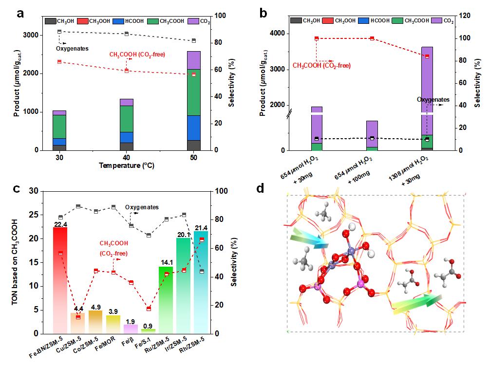 The ZSM-5 supported Fe binuclear sites can afford 89% total oxygenates selectivity with 66% being CH3COOH in oxygenated products at 30 °C. Particularly, 100% CH3COOH selectivity in oxygenated products can be obtained over Fe-BN/ZSM-5 by optimizing reaction conditions if the formed CO2 was not taken into consideration.