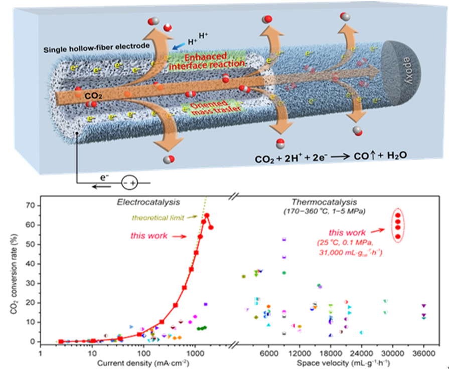 Motivated by such challenge, a research team led by Prof. WEI Wei and CHEN Wei reported a hierarchical micro/nanostructured silver hollow fiber electrode that reduces CO2 to CO with CO2 conversions exceeding 54% at a high space velocity of 31,000 mL · gcat-1 · h-1 under ambient conditions, maintaining stable large current densities (~1.26 A·cm-2) and high CO faradaic efficiencies (~93%). The results were published in the latest Nature Communications.