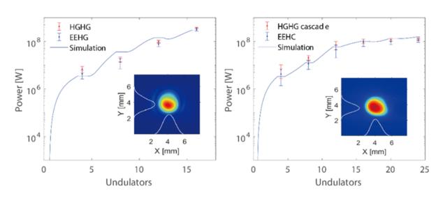 Fig. 1 FEL gain curves for the first- (left) and second-stages (Image by SARI)