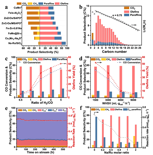 Motivated by such a challenge, a research team led by Prof. ZHONG Liangshu at the Shanghai Advanced Research Institute (SARI) of the Chinese Academy of Sciences reported a non-classical Fischer-Tropsch to olefins (FTO) process featuring high carbon efficiency that realizes 80.1% olefins selectivity with ultralow total selectivity of CH4 and CO2 (<5%) at CO conversion of 45.8%.