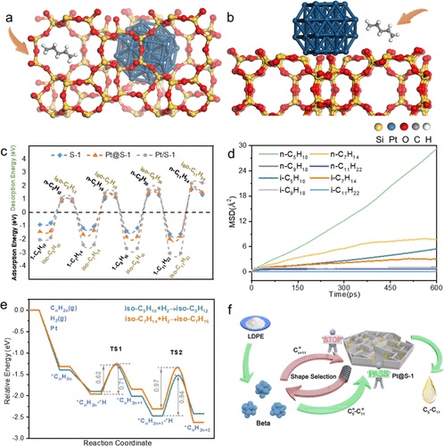 The selectivity of normal alkanes catalyzed by Pt@S-1 and β zeolite reached 34%, about 10-20% higher than that on Pt/S-1, and the alkane products were narrower. The differences between the two catalysts were possibly due to the confinement effect and shape-selectivity of Pt@S-1. Thus, combined density functional theory (DFT) and molecular dynamics simulations were used to reveal the shape-selectivity process, as the diffusion and shipping of olefin intermediates with the right size were boosted within Pt@S-1, which led to narrower-distributed products.