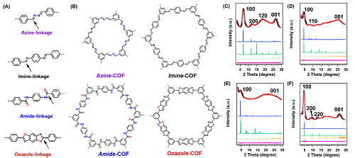 Chemical structures of COFs (azine-, imine-, amide-, and oxazole-COF) with different linkages (Image by SARI)