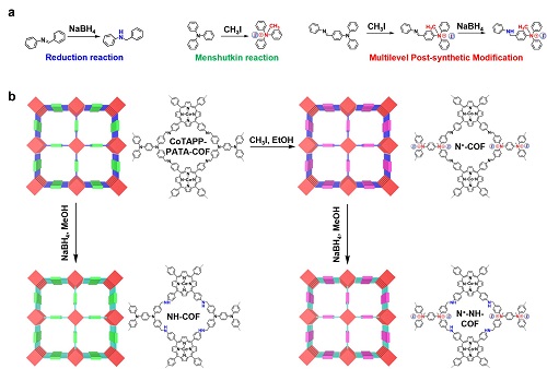 This work provides a deeper understanding of COFs in CO2 reduction reaction. In the meantime, it sheds light on constructing multilevel post-synthetic modification COFs towards tailored activity and high stability.