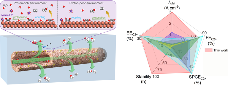 Thus, a CO2 single-pass conversion rate exceeding 51% with a C2+ Faradaic efficiency of 73.4% and partial current density of 2.2 A cm-2 was achieved in acidic solution (pH = 0.71). The performance of the Cu penetration electrode approximated to or even outperformed those of the state-of-the-art Cu base catalysts.