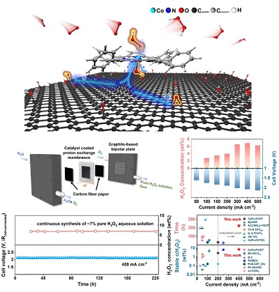 It was found that PEM electrolyzer with the CoTPP@RGO-160 catalyst could continuously produce pure H2O2 aqueous solution with a high concentration of up to ca. 7 wt% at 400 mA cm-2 over 200 h with a low cell voltage of ~2.1 V, demonstrating the breakthrough of exceptional stability.