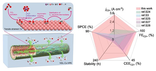 Experimental measurements, in-situ spectroscopy studies, and density functional theory simulations revealed that tensile-strained Cu HPE boosted the asymmetric C–C coupling to steer the selectivity and activity of C2+ products.
