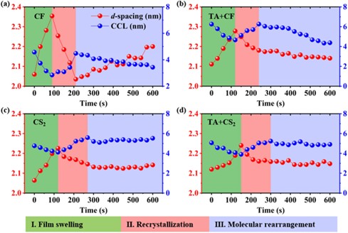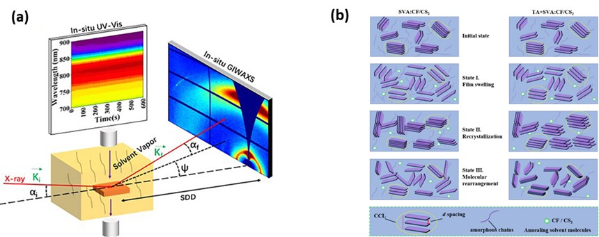 In situ GIWAXS analysis further confirmed three characteristic stages in the SVA process includes: solvent swelling, recrystallization, and molecular rearrangement. An appropriate SVA duration helps stabilize the crystalline structure, as evidenced by reduced lattice spacing, increased charge carrier mobility, and optimized phase separation dimensions, ultimately improving the power conversion efficiency (PCE) of the device. However, prolonged SVA can lead to re-swelling during molecular rearrangement, which is detrimental to performance.